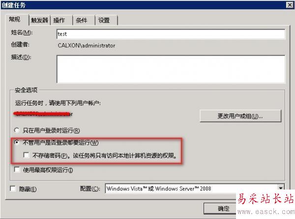 1、創建任務計劃時,要在常規選項卡里選中“不管用戶是否登錄都要運行”、“使用最高權限運行”、配置選帶有“Windows Server 2008 R2”這三個選項,