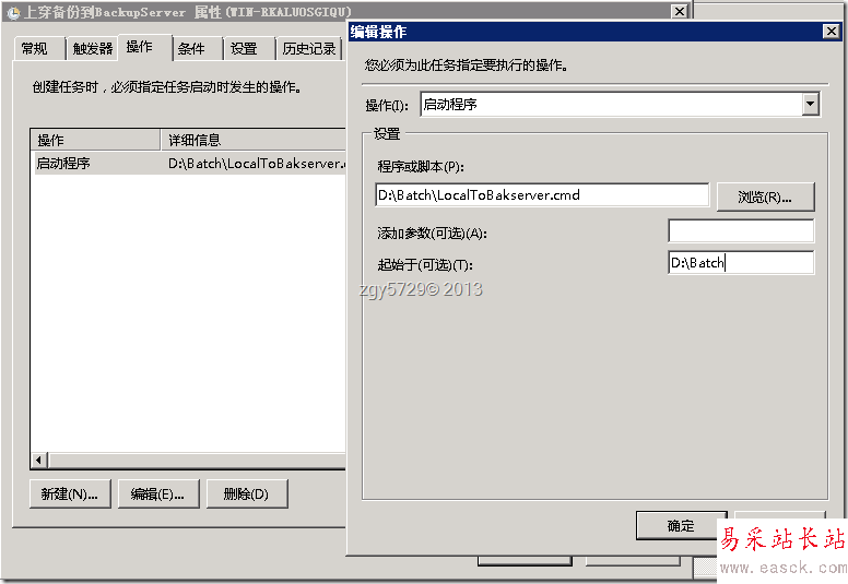 2、在操作選項卡里的“起始于(可選)”要填上bat批處理文件所在目錄,windows 2003是在選擇bat批處理文件自動帶上的,而2008不會,雖然它提示是可選的,但是不填的話,執行會失敗;