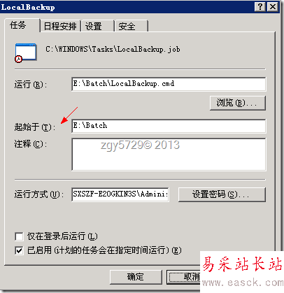這里回顧一下,兩個版本操作系統的任務計劃的不一樣,Windows Server 2003 下面可以選擇的內容,項目并不多,不過他默認的情況下會將起始于填寫進去,使用的就是所在腳本的上一級目錄。
