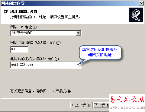 選擇網站IP(通常不用改變),端口為80,如果有需要可以更改為其他端口但訪問時網頁地址將變成http://mail.XXX.com:端口(修改的端口)