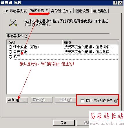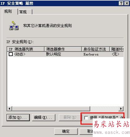 7. 雙擊策略,彈出窗口IP安全策略屬性;去掉“使用添加向導”前面的勾
