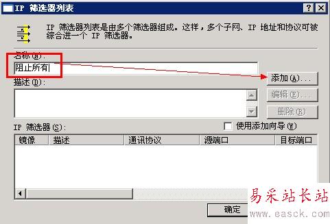 9. 點擊上圖中的“添加”彈出以下窗口,命名名稱為,阻止所有,也就是待會下面所講的阻止所有的端口及IP訪問