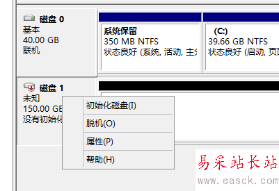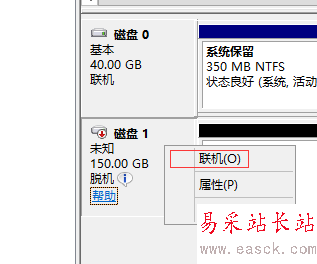 聯機之后再在磁盤1的按鈕處單擊右鍵,選擇“初始化磁盤”