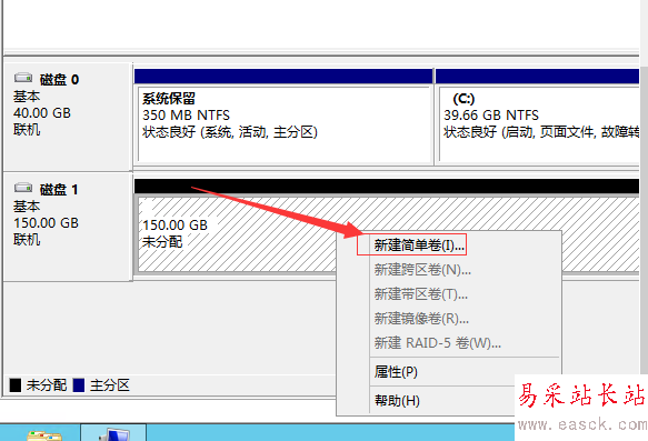 在未分配的空間處單擊右鍵,選擇“新建簡單卷”