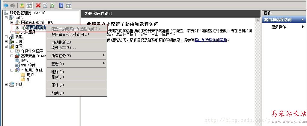 右鍵點擊“路由和遠程訪問“——點擊“配置并啟動路由和遠程訪問”如下圖:(因為本人已經配置過所以灰色,但你們配置的時候并不是灰色的)