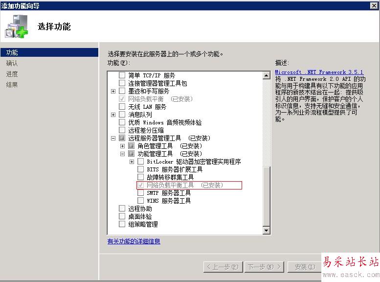 點擊右邊的添加功能進入找到“遠程服務器管理工具”—>“網絡負載平衡工具”勾選篩選框點擊安裝, 以下圖為安裝成功后的圖