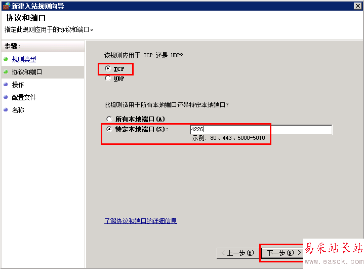 6、選擇“TCP”協(xié)議,然后在“特定本地端口”輸入用戶自定義的遠(yuǎn)程端口號,然后“下一步”,如下圖所示;