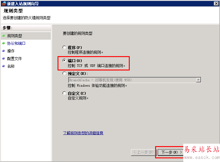 5、出現(xiàn)“新建入站規(guī)則向?qū)А边x擇“端口”,然后“下一步”,如下圖所示;