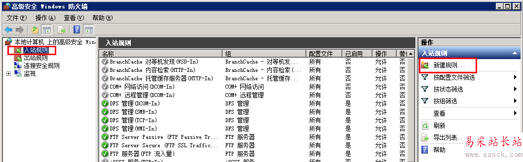 4、打開“高級安全Windows防火墻”后,首先選擇左側(cè)“入站規(guī)則”,然后在右側(cè)選擇“新建規(guī)則…”,如下圖所示;