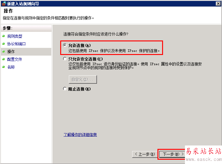 7、選擇“允許連接”,然后“下一步”,如下圖所示;