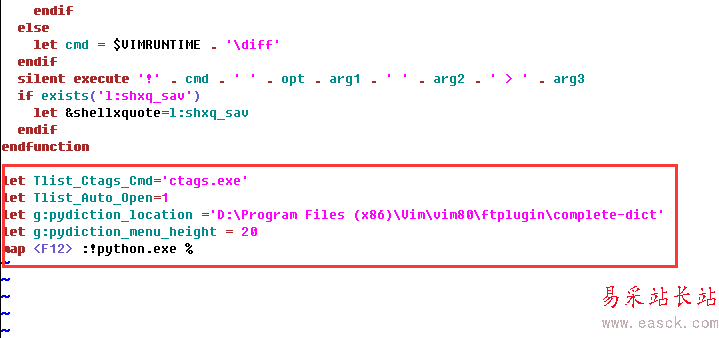 let Tlist_Ctags_Cmd='ctags.exe' (注:如果ctags.exe并沒有放置在第2步中所說的文件中,這里要給出完整的路徑)let Tlist_Auto_Open=1let g:pydiction_location ='D:/Program Files (x86)/Vim/vim80/ftplugin/complete-dict' (注:單引號里是你自己的vim路徑)let g:pydiction_menu_height = 20map <F12>:!python.exe % (這條語句是用來設置編譯快捷鍵,程序編寫完成后按F12即可)