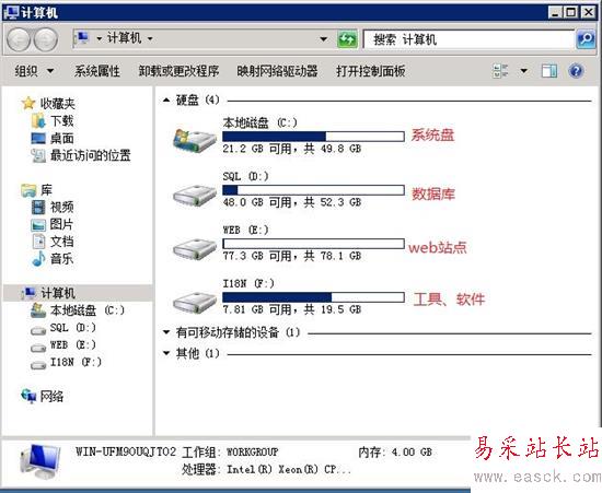 SQL數據庫專門存放數據庫文件。WEB盤專門放網站目錄程序,I18N盤放一些需要用的軟件安裝包,如FTP軟件、數據庫軟件、解壓縮等。
