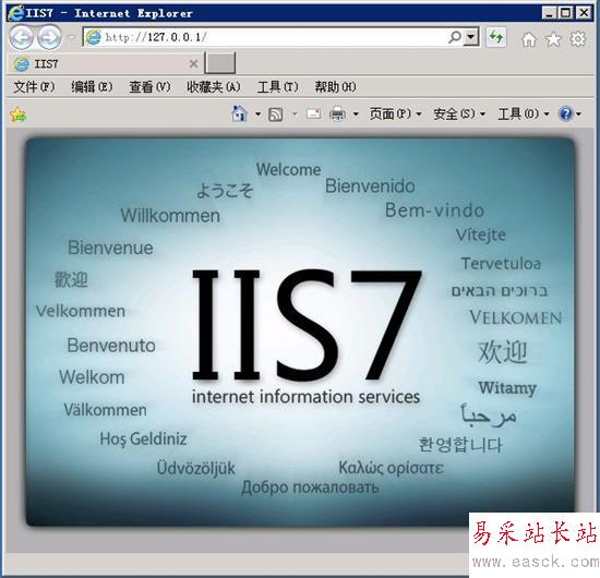 在瀏覽器中輸入127.0.0.1,即可打開IIS默認頁面。