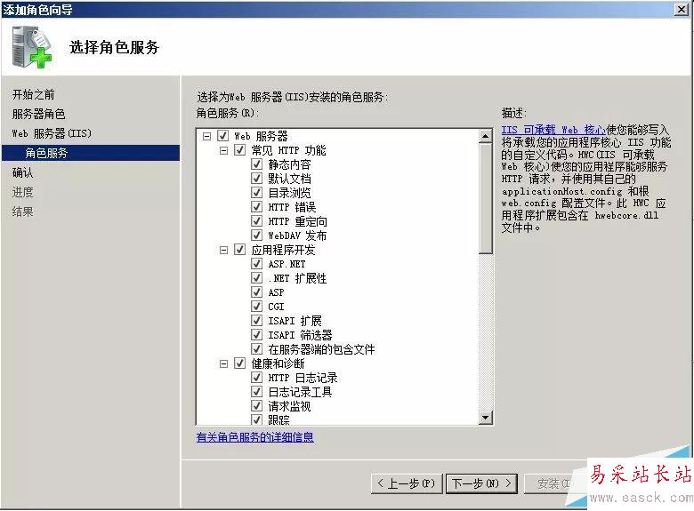 3:選擇Web服務器中的角色服務組件,一般采用默認的選擇即可,如果有特殊要求則可以根據實際情況進行選擇。