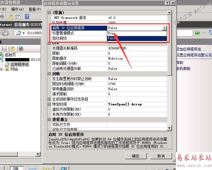 解決辦法其實也是比較簡單的:在II6管理器中,找到左欄的“應用程序池” ,然后在右邊欄“設置應用程序池默認設置” ,在彈出的窗口中,常規 項下 “啟用32位應用程序” 該參數 設置為TRUE ,就可以安裝了