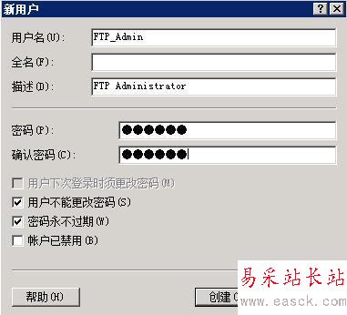 B. 輸入用戶名,全名和描述可以不填寫;輸入兩遍密碼;可以設置“用戶不能修改密碼”和“密碼永不過期”;選擇“創建”;