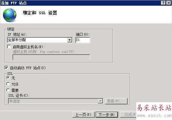 選擇你希望開放的IP地址(默認選擇全部未分配,即所以IP都開放)和端口(默認選擇21);SSL請根據您的具體情況選擇,如無需使用SSL,請選擇“無”;選擇“下一步”;