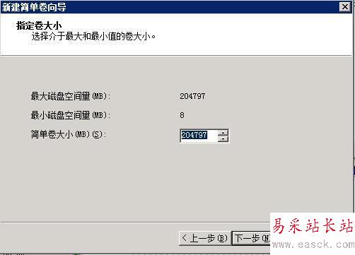 4、 設置簡單卷的大小,即分區的大小;默認會選擇所有剩余空間。您也可以根據需要,指定分區大小;選擇“下一步”;