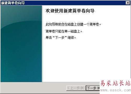 3、 啟動新建簡單卷向導;選擇“下一步”;