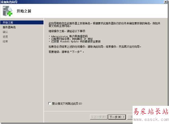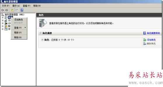 打開2008的服務器管理器,在左側窗格中右鍵點擊“角色”,選擇“添加角色”,打開角色添加向導