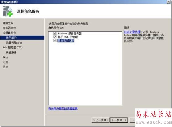 選擇windows媒體服務器、基于Web方式的管理工具和日志代理功能。如果選擇安裝Web方式管理工具,需要安裝IIS組件。下一步