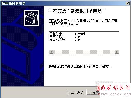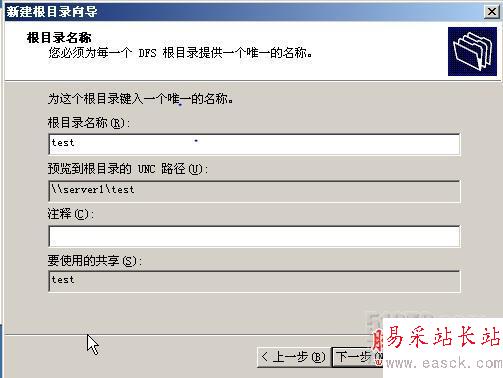 注:改圖下面的“要使用的共享”一項(xiàng)的內(nèi)容是“test”,表示DFS根目錄要使用該服務(wù)器上的共享文件夾“test”