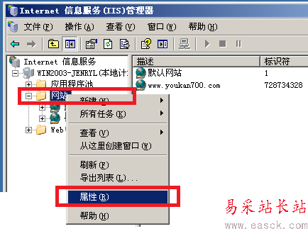 我們打開Internet 信息服務(IIS)管理器,找到“網站”,右鍵打開“屬性”選項卡;