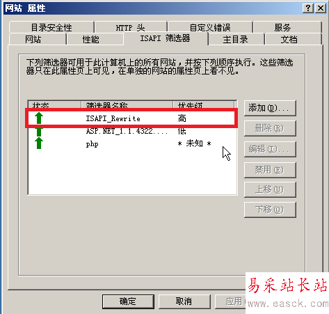 一路確定之后,我們重啟下IIS管理器,之后再次打開網站屬性的“ISAPI 篩選器”,看下是不是剛剛添加的ISAPI_Rewrite變為綠色向上的箭頭呢?這樣的話偽靜態就配置成功了。
