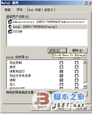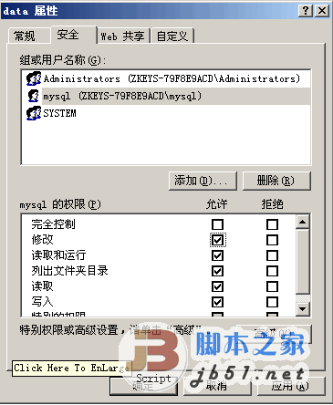 反點D盤,屬性,安全,高級,添加,輸入創建的帳戶名,選擇:只有該文件夾,勾上:讀取權限(倒數第三個),點確定。MSSQL的DATA目錄給MYSQL帳號讀寫權限