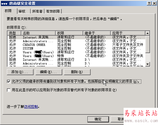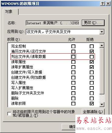 Windows或Winnt目錄的設置如圖:“列出文件夾/讀取數(shù)據(jù)”這個不要設置拒絕。