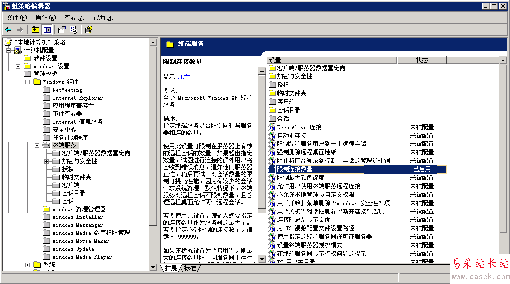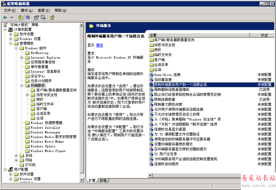 開始-運行-gpedit.msc-計算機配置-管理模板-windows組件-終端服務-會話
