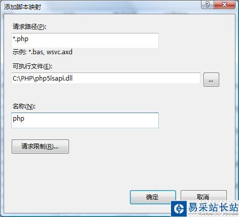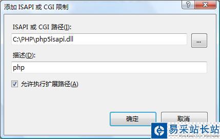 6、在“ISAPI和CGI限制”里點右鍵“添加”,路徑還是選成c:/php/php5isapi.dll,描述還寫成php,選中“允許執行擴展路徑”。