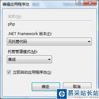 4、打開Vista管理工具中的“Internet信息服務(IIS)管理器”,在“應用程序池”中新建一個應用程序池,取名為PHP,.Net版本為“無托管代碼”。