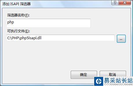 5、在“ISAPI篩選器”中點右鍵“添加”,起名為php,可執行文件選成C:/php/php5isapi.dll。