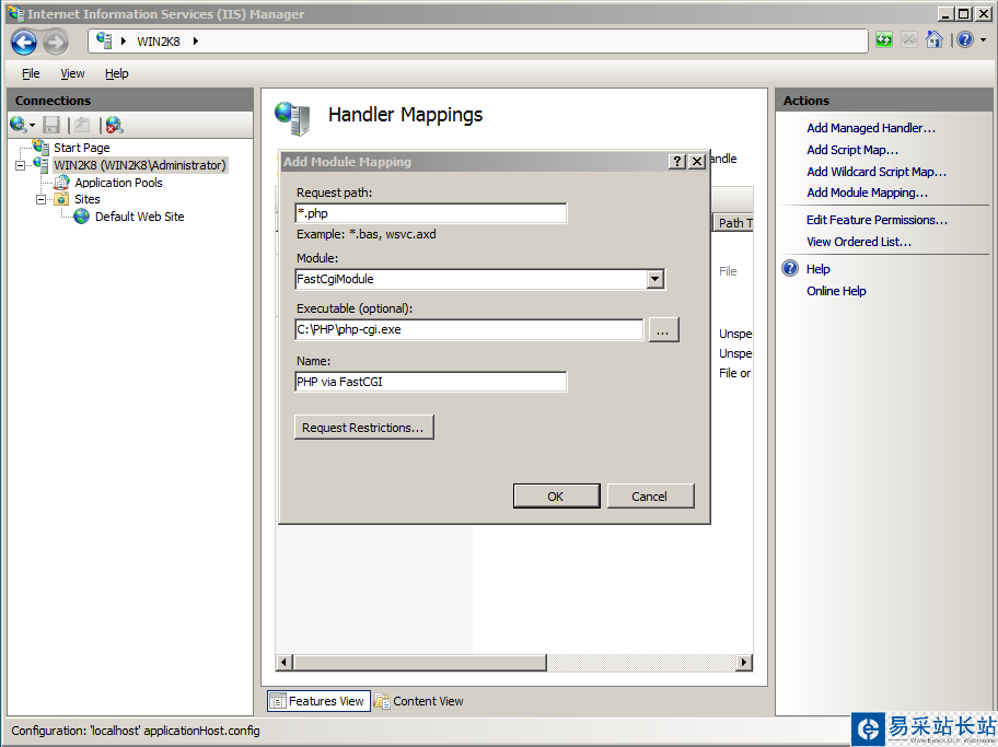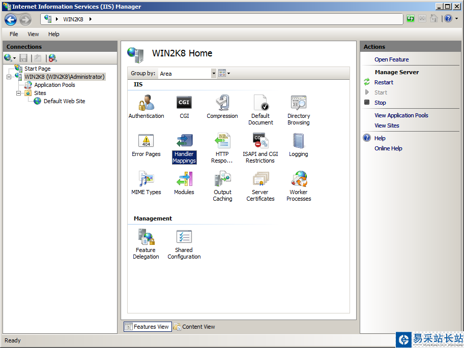 下面,回到IIS上,打開IIS控制臺,在左邊樹中選最頂級結點,也就是你的電腦名,然后在中間(功能視圖)里打開“Handler Mappings”(中文叫“處理程序映射”),如下圖: