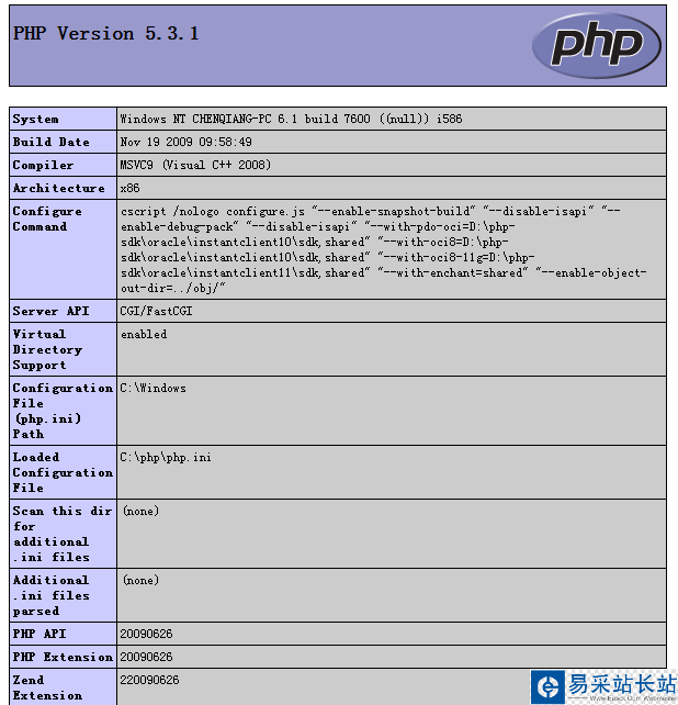 然后就是“確定”,等著安裝,接下來是PHP了,在“http://windows.php.net/download/”里下載,我下的是VC9 x86 Thread Safe的Zip包,5.3.1的(寫文時最新的)。下好后解壓到隨便哪個目錄里,我放到C:/php目錄下,做下面的工作: