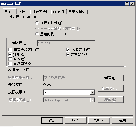 對付上傳,我們可以總結為:可以上傳的目錄不給執行權限,可以執行的目錄不給上傳權限。Web程序是通過IIS用戶運行的,我們只要給IIS用戶一個特定的上傳目錄有寫入權限,然后又把這個目錄的腳本執行權限去掉,就可以防止入侵者通過上傳獲得webshell了。配置方法:首先在IIS的web目錄中,打開權限選項卡、只給IIS用戶讀取和列出目錄權限,然后進入上傳文件保存和存放數據庫的目錄,給IIS用戶加上寫入權限,最后在這兩個目錄的“屬性”—“執行權限”選項把“純腳本”改為“無”即可。見下圖