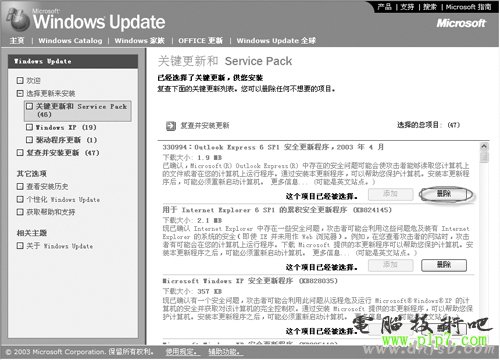 2.“手工更新”就是在我們“關閉自動更新”功能之后,在Windows XP中,選擇“開始→所有程序→Windows Update”命令來進行系統的更新。之后系統會自動打開Internet Explorer去登錄微軟的更新中心——http://windowsupdate.microsoft.com/,在搜索更新期間,你可能會收到一個或多個安全警告,單擊“是”按鈕,點擊“掃描以尋找更新”可以對您自己的計算機進行全方位的掃描并尋找更新,過一段時間后,會列出需要更新的項目及內容(包括關鍵更新、Service Pack、Windows XP、驅動程序更新等),如圖3所示。點擊列出的更新項目,你可以根據需要來選擇安裝的更新程序(每個更新都又詳細的介紹),單擊“添加”按鈕可以添加需要安裝的項目,單擊“刪除”按鈕可以刪除不想安裝的更新項目。最后單擊“復查并安裝更新”按鈕就可以列出需要下載并安裝的更新項目,單擊“立即安裝”按鈕就可以下載并安裝更新項目了。下面你就可以按提示一步一步來下載并自動安裝更新項目了,最后重啟計算機,完成安裝。