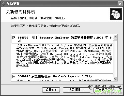 從Windows 98第二版開始,微軟的Windows操作系統就采用了一種名為“Windows Update”的聯機擴展功能,通過該功能可以讓你的計算機得到及時更新。使用Windows Update可以自動從微軟官方網站下載計算機安裝的軟、硬件更新程序,包括最新的驅動程序、安全修復補丁、關鍵更新、最新的幫助文件、微軟的Internet產品等等,這樣可以讓計算機支持更多的軟、硬件,解決各種兼容性問題,排除各種故障等。常見的安全修復補丁有Windows 2000、Internet Explorer 6.0、“沖擊波”等等,使用了這些補丁可以保證系統的安全。在Windows XP中,一般情況下在系統任務欄中會自動打開“保持自動更新”圖標,默認的狀態是“自動下載更新并且當更新就緒可以安裝時通知我”。這樣啟動Windows XP后,在訪問Internet的時候,就可以自動下載并提示你為計算機安裝重要的軟件和硬件更新。