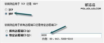 然后按要求選擇TCP還是UDP,這里我們選擇UDP。然后選擇特定遠程端口,在下面輸入8000。