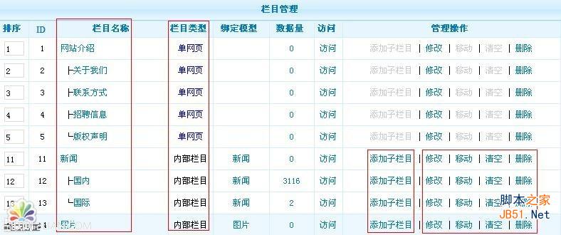 管理欄目,修改、添加子欄目、刪除、移動、清空操作