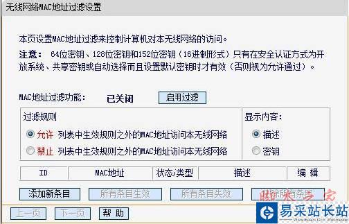 通過有線登陸路由器管理界面,“無線參數(無線設置)”-“MAC地址過濾”,確認其為關閉狀態。