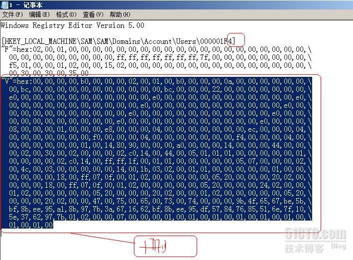 6.點擊1.reg選擇編輯,可以看到里面有F和V倆個二進制值,刪除V值,并將F值復制到GUEST帳戶。再注冊表值000001F4改成000001F5,然后再保存就好了。
