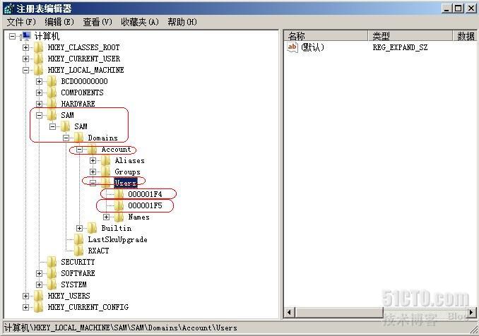 4.展開SAM下面的--“Domains”--“Account”--“Users”,可以看到下面有許多項,其中“000001F4”就是管理員帳戶"administrator"所對應的項,而"000001F5"就是來賓帳戶"guest"對應的項。