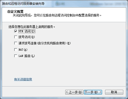 如果服務器有兩張網卡,選擇“遠程訪問(撥號或VPN)”,如果只有一張網卡,則選擇自定義配置并在下一步中勾選VPN。