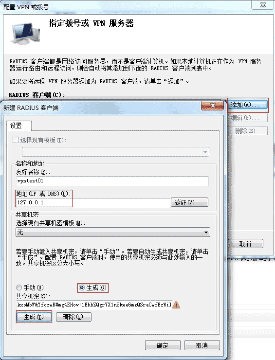 添加一個RADIUS客戶端,取個友好名稱,地址就本地IP吧,然后生成一個共享機密,當然手動輸入也可以。這不是密碼。