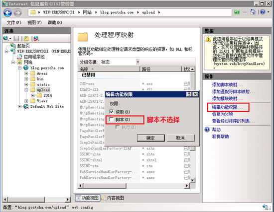 經過上面這樣設置承在一個執行權限,一旦用戶上傳了惡意文件,我們的服務器就淪陷了,但是我們這里又不能不給,所以我們還要配合IIS來再設置一下。