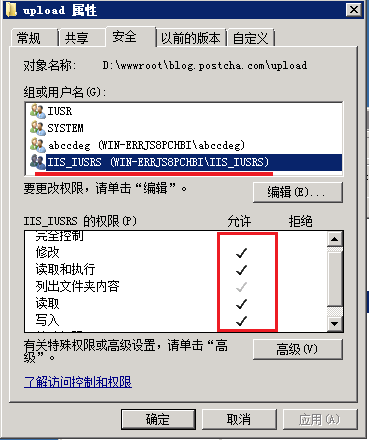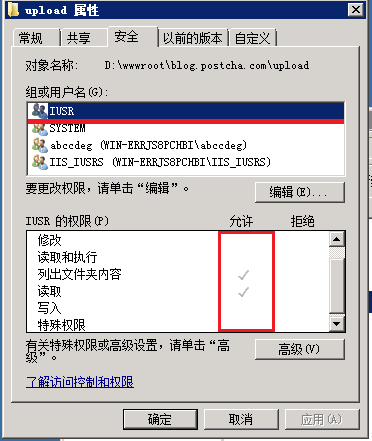 一般的網站都有上傳文件、圖片功能,而用戶上傳的文件都是不可信的。所以還要對上傳目錄作單獨設置。上傳目錄還需要給IIS_IUSRS組再添加“修改”、“寫入”權限。