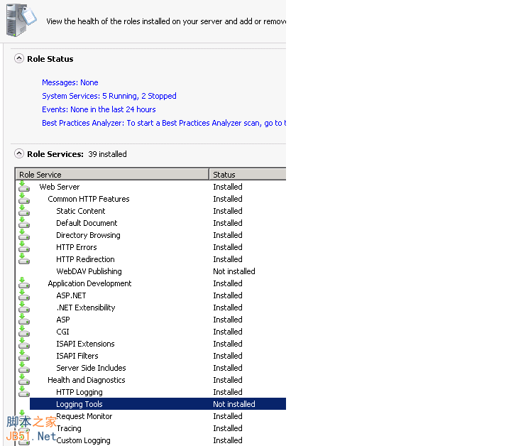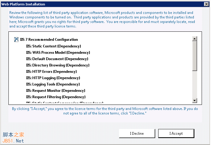 圖6可以看到很多IIS組件加載失敗了,原因是IIS上我沒加載,于是在IIS中重新加載了下相應(yīng)的組件,之后點(diǎn)擊IIS 7 Recommended Configuration后的Add然后點(diǎn)擊Install看到: