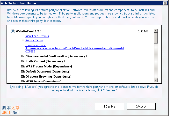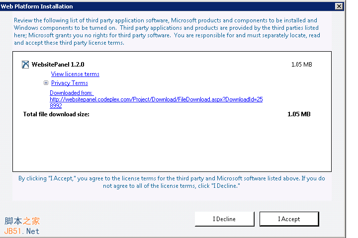 訪問官網(wǎng)http://www.microsoft.com/web/gallery/install.aspx?appid=websitepanel下載WebsitePanel安裝程序,在這個(gè)頁面點(diǎn)擊Install Now后下載websitepanel.exe安裝程序。